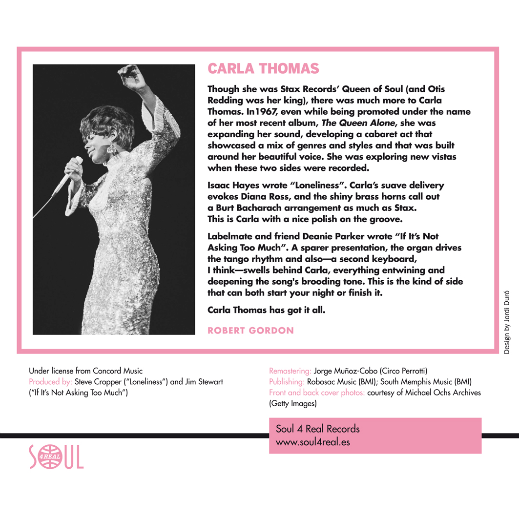 Though she was Stax Records’ Queen of Soul (and Otis Redding was her king), there was much more to Carla Thomas. In 1967, even while being promoted by the name of her most recent album, The Queen Alone, she was expanding her sound, developing a cabaret act that showcased a mix of genres and styles and that was built around her beautiful voice. She was exploring new vistas when these two sides were recorded.