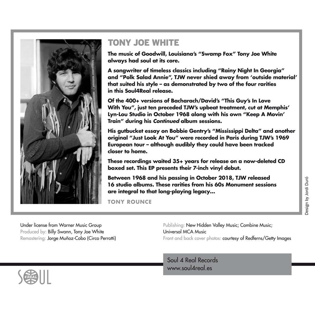 A songwriter of timeless classics including “Rainy Night In Georgia” and “Polk Salad Annie”, TJW never shied away from ‘outside material’ that suited his style – as demonstrated by two of the four rarities in this Soul4Real release.
